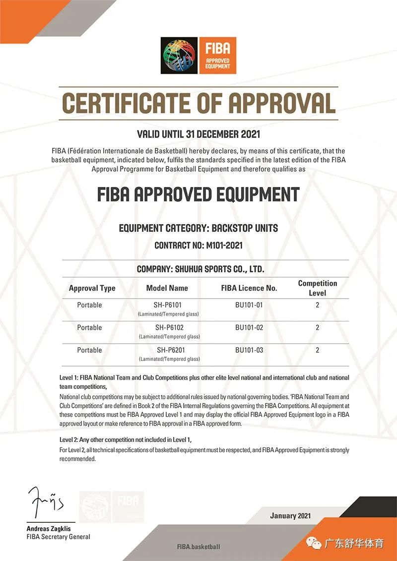 據悉,國際籃聯是負責組織管理籃球運動比賽的開辦及運營的國際性聯合協會。國際籃球比賽規范要求只有通過國際籃球聯合會FIBA認可, 取得FIBA認證的籃球運動設備器材和場地才可用于國際性籃球比賽。因此FIBA認證申請流程和條件十分嚴格。國際籃聯對舒華體育及籃球架產品進行了全方位考察和一系列嚴苛的產品檢測認證。最終,舒華體育多款籃球架產品經過FIBA專業設備測試,并獲得了FIBA認可證書,這也意味著舒華體育實力和舒華體育籃球架的質量得到了全世界200多個國家和地區的籃球聯合會的認可。